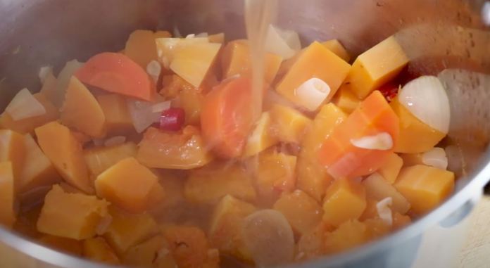 - Ajoutez dans la poêle la courge musquée que nous avons hachée plus tôt, ainsi que la carotte.