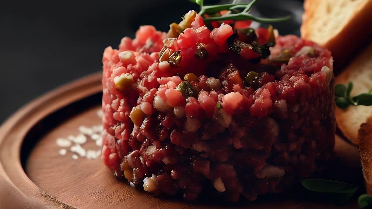 Le steak tartare est un plat français classique à base de viande de bœuf ou de cheval crue et finement hachée, généralement assaisonnée avec des ingrédients tels que des câpres, de la moutarde de Dijon, des échalotes, de la sauce Worcestershire et des herbes fraîches. La viande est généralement servie avec un jaune d’œuf cru sur le dessus, qui est mélangé à la viande avant de manger pour ajouter de la richesse et de l’onctuosité.