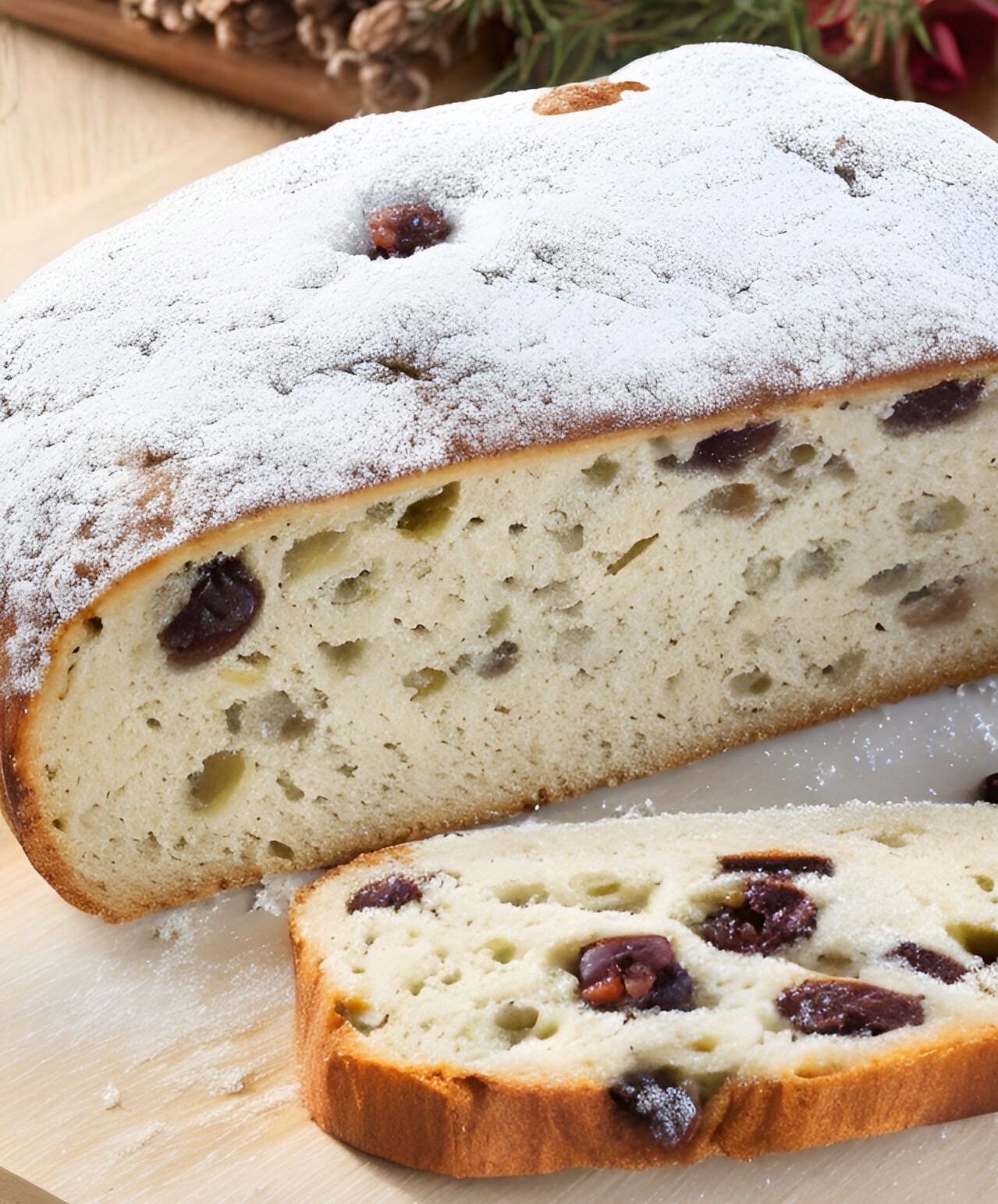 Stollen est un pain aux fruits sucré et riche fait d’une pâte levée qui contient des ingrédients comme la farine, le beurre, le sucre, le lait et les œufs. Il est généralement parsemé de fruits confits, de fruits secs tels que les raisins secs et les raisins de Corinthe, et parfois de noix comme les amandes. La pâte est souvent aromatisée avec des épices comme la cannelle, la muscade et la cardamome, qui contribuent à son arôme et à son goût festifs.
